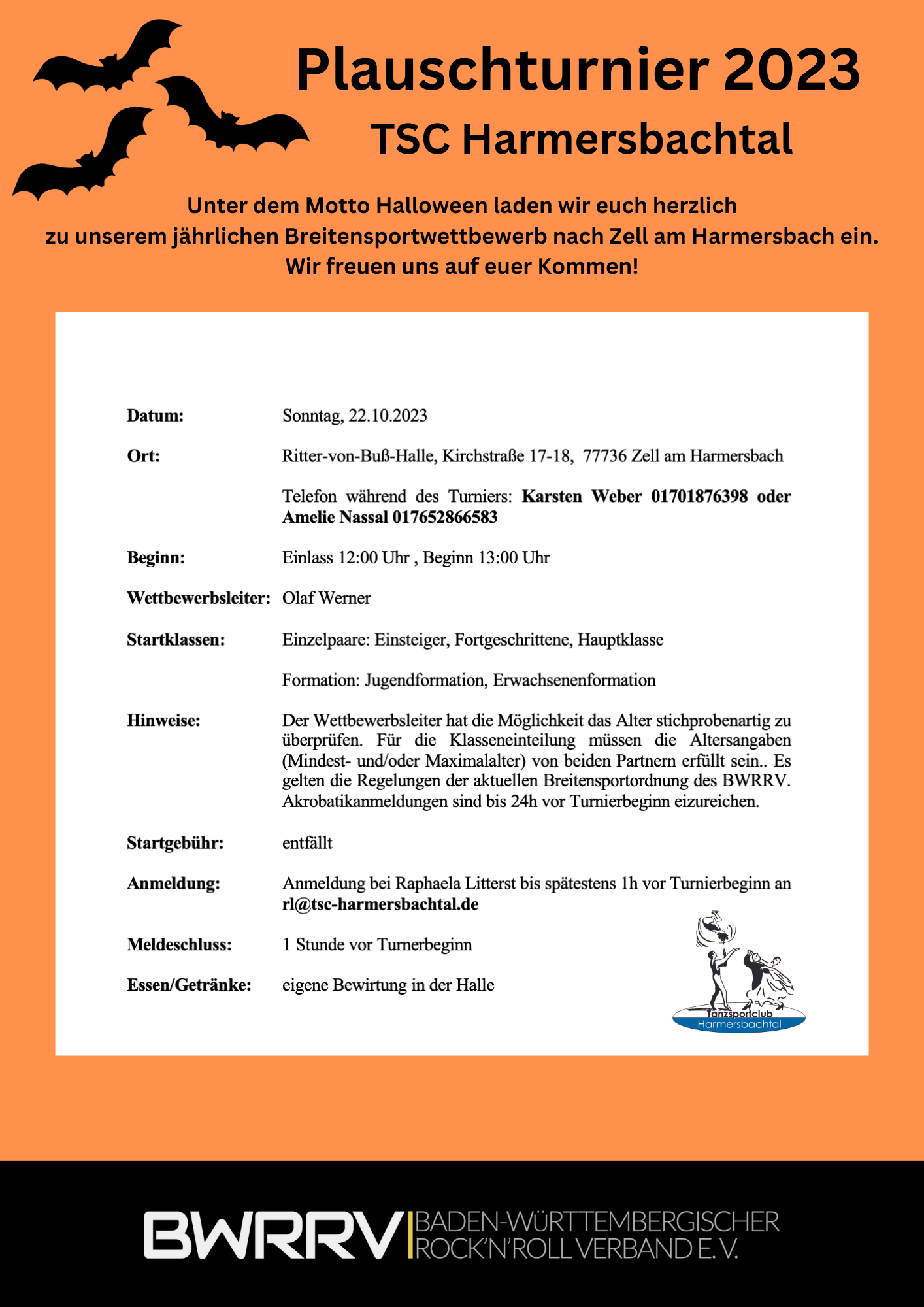 der TSC Harmersbachtal lädt am Sonntag, 22. Oktober 2023 zum Plauschturnier 2023 für Breitensportler Rock ’n’ Roll und dem 1. Zeller Boogie-Woogie Cup in die Ritter-von-Buß-Halle nach Harmersbach ein.